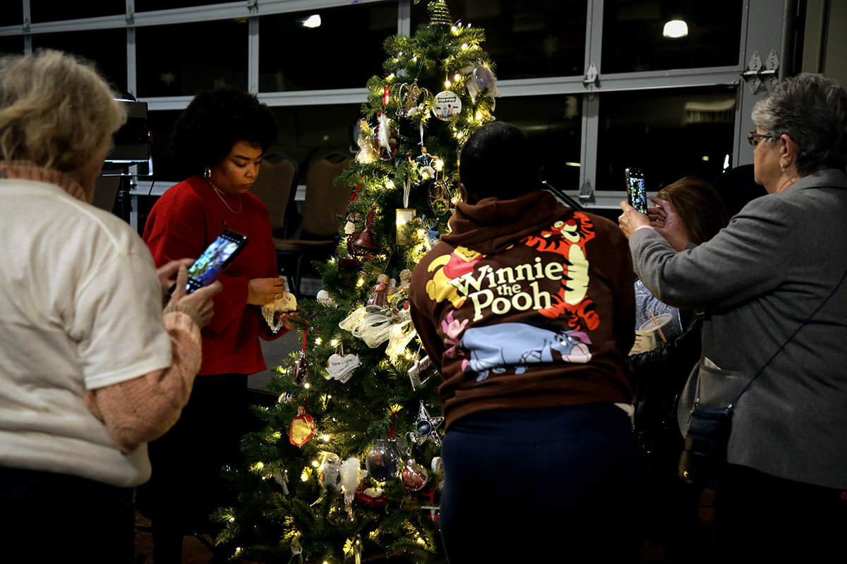 Family and friends of the victims, along with law enforcement, place a handmade Christmas ornament on two trees. Before hanging the ornament, many introduced themselves and the name of the person they had lost.